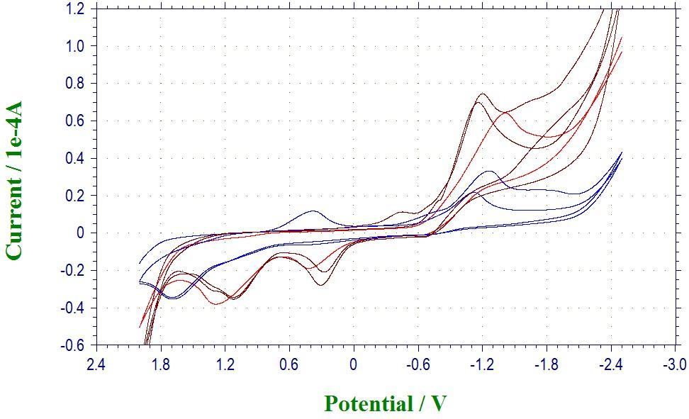 我第一次循环伏安法,做我做的一个聚合物,测试电化学,循环伏安法,是为了估算HOMO和LUMO能级,也就是带隙,可自己那不太准,望各位高手指教!我的图蓝色的线是空白,另外两个是样品,他们基本结构一样,只是分子量有差别!