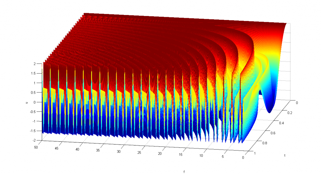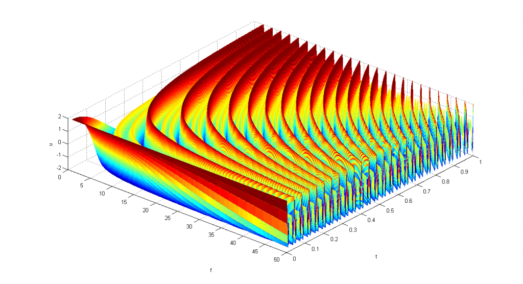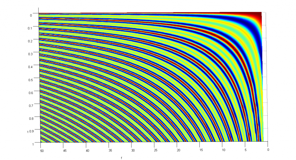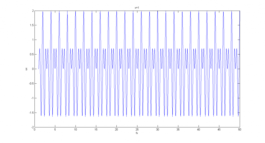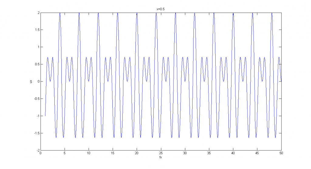 问题描述: f=1:5:50 y=cos(2*pi*f*t)+cos(3*pi*f*t) f是频率,t是时间,一组f值对应一组y,而y又是时间t的函数,应该怎样得到y的幅值随频率f的变化曲线? [f,t]=meshgrid(1:5:50,0:0.01:1); u=cos(2*pi*f*t)+cos(3*pi*f*t); mesh(f,t,u); 这样为什么画不出来? 哪位高手帮忙指点下,非常感谢!! |