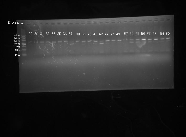 根据原理,杂合子应该是三条带,大小分别是(226bp,173bp和53bp),可是样本的53bp的条带很不清晰,例如编号42、54、55等的条带,看起来像是切成了三段,但是53bp处的条带又很不清晰。