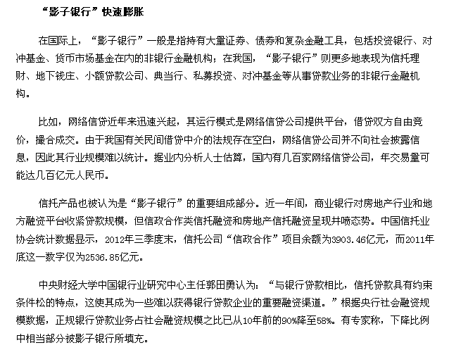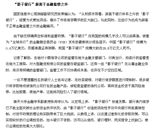 近年来,我国银行贷款占全社会融资总量的比重有所下降,而“影子银行”则迅速发展,不仅改变了传统金融结构,而且开始挑战监管体系和货币政策。有关专家呼吁,建立新型风险监管体系和完善金融调控手段已经刻不容缓。 1.png 2.png 3.png 4.png [ 来自版块群 河南公务员考试 ] |