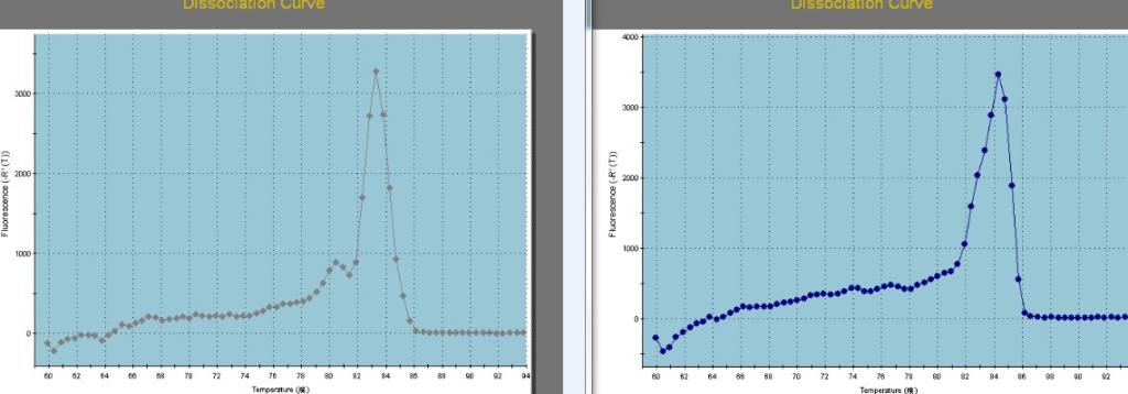如果熔解曲线中出现不同的峰说明产物不单一。跑胶的灵敏度远远比不上荧光定量的检测线,胶上一条带不能说明没有非特异扩增和引物二聚体的存在。你图上所说的小峰在定量时肯定会影响结果的。你可以检测一下扩增效率,出现其他峰的反应的扩增效率会偏高,读出的CT值偏小。引物的扩增效率是要做的,否则你用来计算2^(-ΔΔCT)的根据在哪里呢?出现其他峰是和引物设计有关的。可能是引物特异性差或是形成二聚体。 对于退火温度的优化,是要用qPCR的体系的。你也发现了,不同体系得到的最优温度也是不同的。不过可以先用普通PCR检测一下引物是否能P出目的条带,掌握大致的退火温度。 做荧光定量不能怕麻烦,各种条件控制好才能得到可信度高的数据。 |