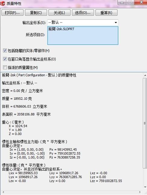| 是这么回事,那个默认坐标系就是SW在画的零件或者装配体中那个一开始主界面中间的两个蓝色箭头确定的,方向和主界面左下角那三个颜色箭头一样,也确定了左边那三个视图基准面,也就是说画图的时候零件在这个默认坐标系的位置就确定了,也确定了下面的参数。重心是由这个默认坐标系确定的,也就是那XYZ是重心在默认坐标系的坐标。再下边的惯性主轴和惯性主力矩是对应的,这里涉及到理论力学的知识,具体的内容比较复杂建议查书,简单点说,惯性主轴是在默认坐标系中的,那Ix,Iy,Iz定义了三个向量,相当于定义了一个新坐标系的三个轴,原点不变,后边的惯性主力矩Px,Py,Pz意义是相对于三个惯性主轴的三个对应轴的转动惯量。而下面的惯性张量(也是相对于默认坐标系)则可以和上边的惯性主轴和惯性主力矩换算,是个包含上边两个信息的矩阵。如果你改变输出坐标系的话,那么所有的参数就是相对于你选择的坐标系而不再是默认坐标系,意义和原来一样。 |