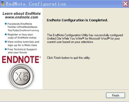 第二种方法是“开始→程序→EndNote→“Configure EndNote”快捷选项,运行Configure EndNote,勾选“Configure EndNote components for me”,选择下一步,勾选“Unified Cite While you Write for the Microsoft Word”,下一步完成。”这种方法我操作时没看到有Unified Cite While you Write for the Microsoft Word这句话,直接完成。