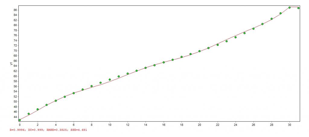 迭代数: 50 计算用时(时:分:秒:微秒): 00:02:14:58 优化算法: 通用全局优化法(UGO1) 计算结束原因: 达到收敛判定标准 均方差(RMSE): 0.457554430452535 残差平方和(SSE): 13.3987876369116 相关系数(R): 0.9999538427357 相关系数之平方(R^2): 0.999907687601893 决定系数(DC): 0.999907687601894 F统计(F-Statistic): 3562.34348909742 参数 最佳估算 -------------------- ------------- g1 927.857807878991 g2 9.57785631266135E-13 g3 30.3737389532088 g4 12.5751749127888 g5 11.2164978073129 g6 17.0073506738556 g7 1.69984592611317E-12 g8 38.0722834931112 ====== 输出结果 ===== 文件:数据文件 - 1 No 目标y1 计算y1 目标y2 计算y2 1 42.75 42.9208655882332 9.227 9.07301175786781 2 45.16 44.6824214427367 9.471 9.76896519890456 3 46.97 46.647739107148 9.602 10.1565588445128 4 48.7 48.6417149047618 9.642 10.1861644022169 5 50.3 50.4807769676214 9.692 9.91884968686892 6 51.83 52.0726793695168 9.666 9.49374507297026 7 53.31 53.4031433386455 9.599 9.06871699358951 8 54.69 54.5459257412626 9.584 8.76090705808797 9 56.06 55.6051504740333 9.458 8.62711010015922 10 57.36 56.6919283086835 9.305 8.65808444172752 11 58.65 57.884623561838 9.237 8.78943502508435 12 59.89 59.2090543844829 9.147 8.92412069327581 13 61.02 60.6209358191493 9.061 8.97205706822433 14 62.11 62.0279852602239 8.981 8.89533200269829 15 63.24 63.3273798375738 9.023 8.73074605029889 16 64.27 64.4760123961251 9.073 8.56849146194841 17 65.35 65.4822607395558 9.146 8.51193568323656 18 66.45 66.4161485371833 9.306 8.63763832848576 19 67.48 67.3696455632238 9.622 8.97648277669657 20 68.61 68.4399021188289 9.99 9.50877077753916 21 69.82 69.6936753378756 10.46 10.1663962825769 22 71.04 71.1462540772053 10.95 10.8557003983832 23 72.26 72.7427110475973 11.61 11.4961422946902 24 73.69 74.3827653652001 12.34 12.0707900142452 25 75.2 75.9629103469361 13.19 12.6445462252856 26 76.84 77.4584805102356 14.14 13.3499721258169 27 78.54 78.9136599671919 15.22 14.3221416933818 28 80.45 80.4572601371014 16.42 15.6622129496805 29 82.49 82.2508432131028 17.76 17.392306553707 30 84.62 84.4617666451246 19.21 19.4489901385217 31 86.93 87.1910850455587 21.01 21.6701667656268 32 86.72 87.1910850455587 20.87 21.6701667656268 |
