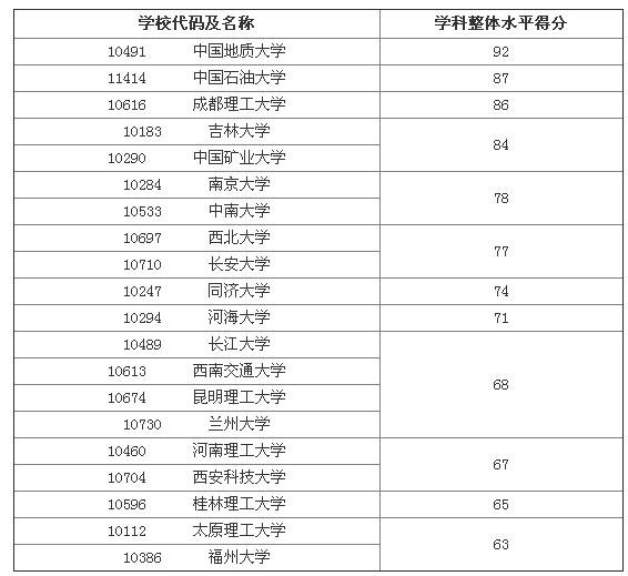 ½ÌÓý²¿Ñ§Î»ÖÐÐÄÊÚȨ·¢²¼2012Äêѧ¿ÆÆÀ¹À½á¹û£¬ÆäÖеØÖÊѧ£¬±¾Ò»¼¶Ñ§¿ÆÖУ¬È«¹ú¾ßÓС°²©Ê¿Ò»¼¶¡±ÊÚȨµÄ¸ßУ¹²15Ëù £¬±¾´ÎÓÐ14Ëù²ÎÆÀ;»¹Óв¿·Ö¾ßÓС°²©Ê¿¶þ¼¶¡±ÊÚȨºÍ˶ʿÊÚȨµÄ¸ßУ²Î¼ÓÁËÆÀ¹À; ²ÎÆÀ¸ßУ¹²¼Æ16Ëù¡£ ×¢£ºÒÔÏÂÏàͬµÃ·Ö°´Ñ§Ð£´úÂë˳ÐòÅÅÁС£ÒÔÏÂÊÇÔÚµØÖÊѧÁìÓòÅÅÃûǰ10ÃûµÄ¸ßУ¡£ ѧУ´úÂë¼°Ãû³Æ ѧ¿ÆÕûÌåˮƽµÃ·Ö 10284 ÄϾ©´óѧ 90 10491 ÖйúµØÖÊ´óѧ 10001 ±±¾©´óѧ 82 10697 Î÷±±´óѧ 80 10358 Öйú¿ÆÑ§¼¼Êõ´óѧ 77 10616 ³É¶¼Àí¹¤´óѧ 10183 ¼ªÁÖ´óѧ 75 10335 Õã½´óѧ 73 10359 ºÏ·Ê¹¤Òµ´óѧ 11414 ÖйúʯÓÍ´óѧ ½ÌÓý²¿Ñ§Î»ÓëÑо¿Éú½ÌÓý·¢Õ¹ÖÐÐÄÖ÷ÈÎÀî¾ü±íʾ£¬´Ë´Îѧ¿ÆÆÀ¹À²»ÒÔ¡°SCIÂÛÎÄÊý¡±µ¥Ò»Ö¸±êÆÀ¼ÛѧÊõÂÛÎÄ£¬Ê״βÉÓá°¶¨Á¿Ó붨ÐÔ¡¢ÖÊÁ¿ÓëÊýÁ¿¡¢¹úÄÚÓë¹úÍ⡱Ïà½áºÏµÄ¡°¶àά¶ÈѧÊõÂÛÎÄÆÀ¼Û¡±·½·¨¡£ |