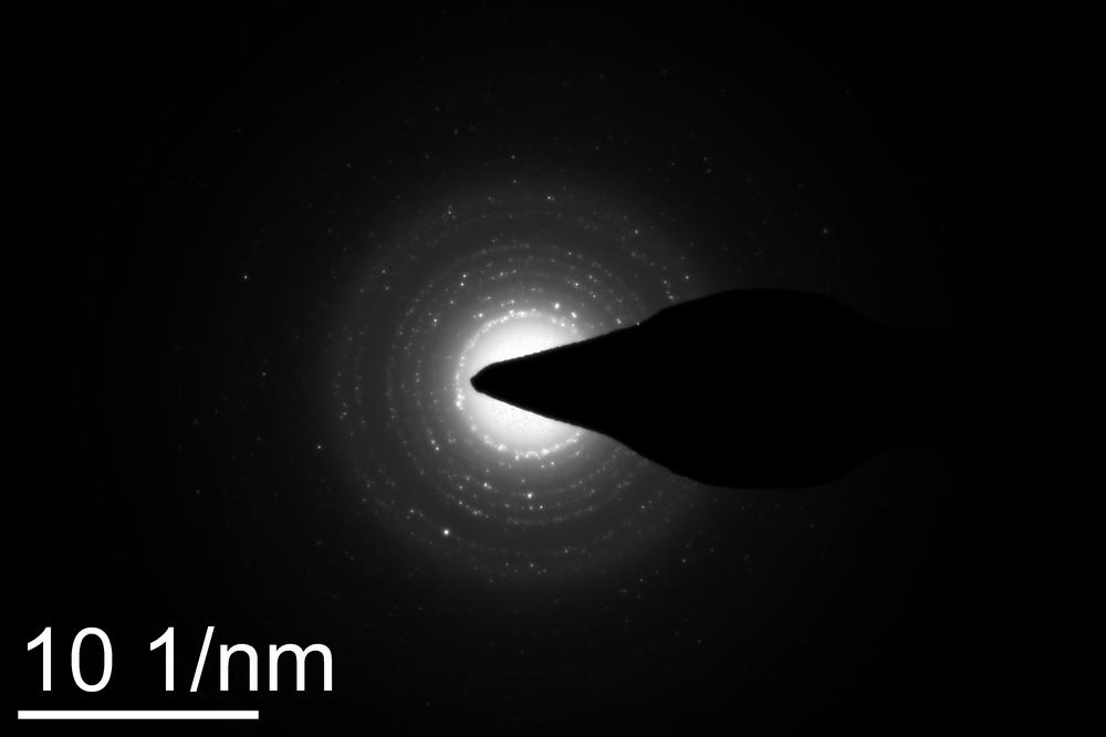 小弟对电子衍射一窍不通,现有一电子衍射图不知道怎么解释,望各位大侠不吝赐教,小弟感激不尽!所测材料是核壳结构的BaMoO4@SiO2。请问由此衍射图能否确认钼酸钡和二氧化硅的存在?其中内核钼酸钡大约16nm,是纳米晶,XRD对应卡片JCPDS:29-0193. 外层二氧化硅壳大约15nm厚,是无定形态。二氧化硅壳的存在是否会对钼酸钡的电子衍射有影响呢?急需知道结果,期待大家相助! |