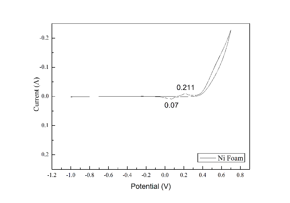 Agcl做参比,手边没有calomel,,6M KOH,, 0上泡沫镍峰很明显,,大家都怎么弄? 用泡沫镍做集流体负载活性物质做测试的时候大于0.5 就上翘, 问问大家的情况,呵呵。 以前用GCE,,头一次摆弄镍泡沫 ni foam whole.gif |