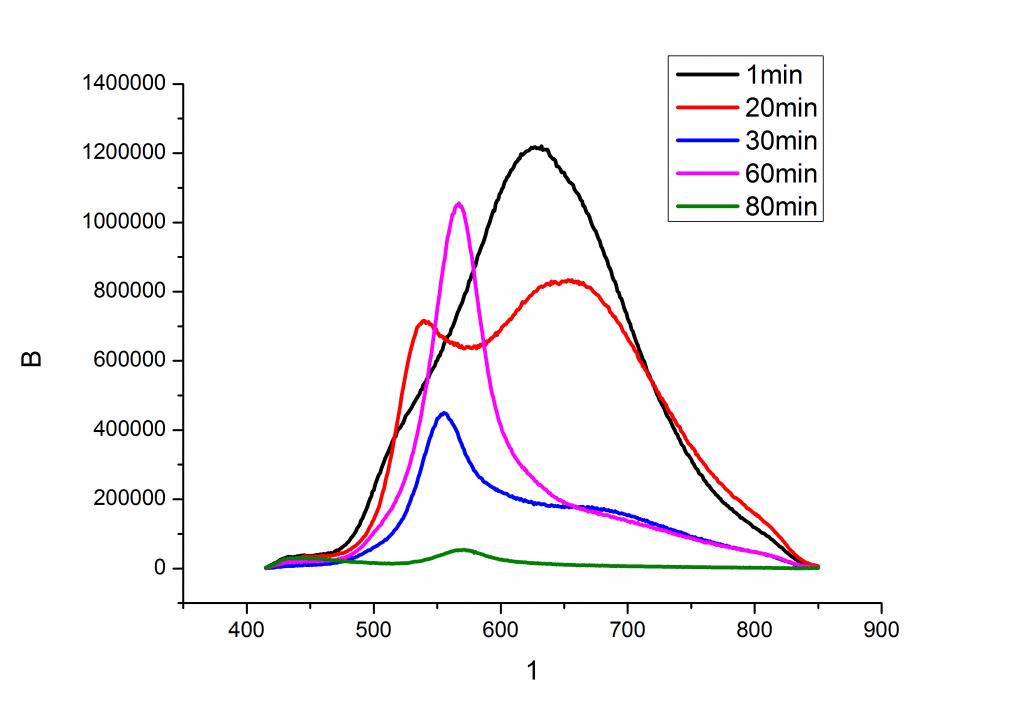 你这个实验好像已经有文献做了相关报道,以前我看过,好像是上海交大的一篇paper。 1.60min的可能是CdSeS合金量子点的PL 2.你的这个实验应该首先生成CdSeQDs,随着温度的升高时间的延长MPA放出硫,此时有两种结构可能的量子点产生一种是alloyed QDs,另外一种是Core-Shell QDs。如果是CdSe/CdS核壳结构的量子点,应该随着时间变化吸收和发生都是红移的,这一点是有很多文章有报道的。另外一种就是合金量子点。 3.20min明显的两个峰,存在两种可能,一种是你测试的时候没有选择好PL的狭缝,导致你测试的时候PL峰发生劈裂,建议你把狭缝调小一点测测看。另外一种可能就是缺陷发射和本征发射。 最后,提个建议。如果你准备用这个实验发文章,创新太低,这个一摸一样的工作已经有人报道。多看一些文献,把实验方法改进一下应该可以发一个SCI。希望对你有点帮助 |