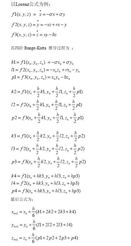 请问多变量的龙格-库塔(Runge-Kutta)公式怎么写? 比如有三个变量x,y,z,组成一个方程组[含3个方程]:(1) x' = f1(x,y,z);(2) y' = f2(x,y,z); (3) z' = f3(x,y,z). 上面这个方程组的四阶龙格-库塔(Runge-Kutta)公式具体的写法是什么? |