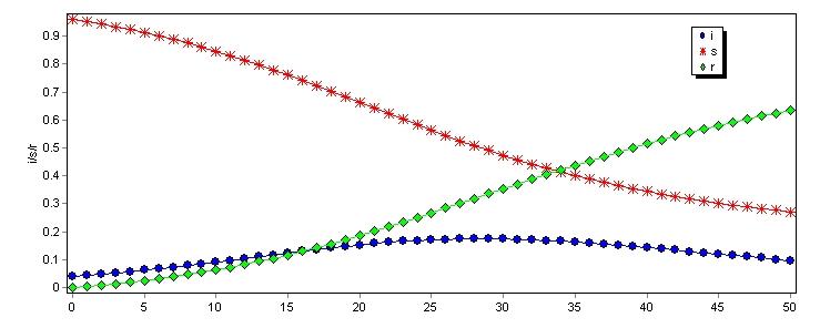 流行病模型 sir dI/dt=a*S*I-b*I dS/dt=-a*S*I dR/dt=b*I S+I+R=1且0 m文件:function y=SIR(t,x) a=0.2;b=0.1; y=[a*x(1)*x(2)-b*x(1); -a*x(1)*x(2); b*x(3)]; 命令:ts=0:50; x0=[0.04,0.96,0]; [t,x]=ode45('SIR',ts,x0); 但并不完备 怎样将“S+I+R=1且0 |