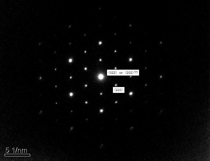 具体问题是这样的: 对SAED图进行了标定,通过测量距离及夹角验证,做出了可能的晶面分析(如图)。现在的问题是:若该晶面为(022),则晶带轴为【1-11】;若晶面为(202),则晶带轴为【1-1-1】。请问这两个晶带轴等同吗?晶带轴是否与晶系相关呢?如果是错的,我的问题出在哪里?求高人指点迷津,谢谢。 f1.jpg PDF 35-0782.jpg |