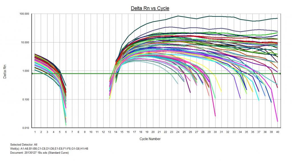 求助虫友:我用18s做内参,cDNA 10倍稀释后,内参ct值都在13左右,样品的才25到30左右,这个内参能用吗,内参会不会太低?附上扩增曲线图,达到平台期后又下降是怎么会事?不很清楚,这结果行吗?谢谢。 20130127 18s.sds_AmpPlot.jpg |