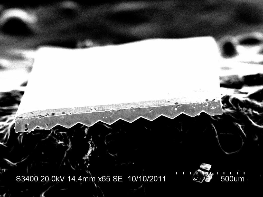 RT,材质为纯铜,厚度0.3mm宽度1.5mm,在其上面加工出宽度150um左右,厚度50um左右的斜槽,角度越尖越好,请问有什么加工方法实现?非常感谢!