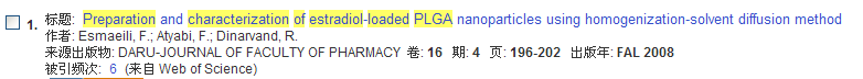 期刊全称是:DARU Journal of Pharmaceutical Sciences 文献名字:Preparation and characterization of estradiol-loaded PLGA nanoparticles using homogenization-solvent diffusion method |