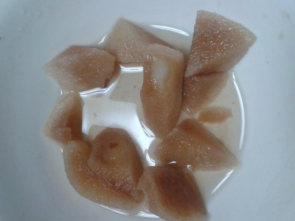 我是把梨切块,里面放冰糖和水,放在锅里蒸的 今天奇怪这个梨放了一会儿就变颜色了,这是怎么回事,前几次的都是白色的啊! 这次唯一不同的是我用的矿泉水蒸的,前几次是用普通凉开水,不过怎么会这样。。。。。。 2013-03-01 18.51.57.jpg |