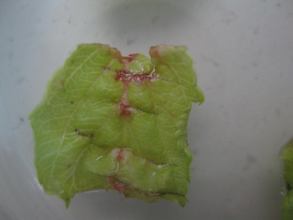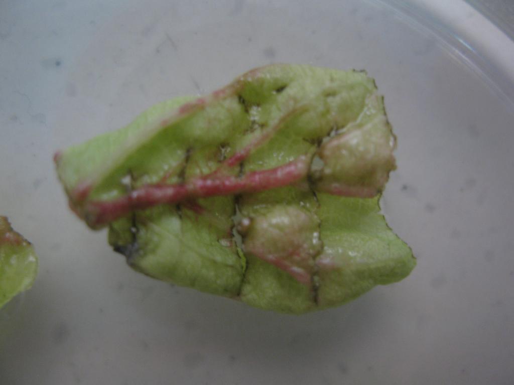 这个是我做的苹果叶片再生图片,不管是品种还是砧木都出现了这样的情况,就是叶片见光后切口处和叶脉变红了,再生很差,但也不是每次都这样,请问是怎么回事呀?是细菌污染吗?谢谢啦 IMG_0566.JPG IMG_0568.JPG |