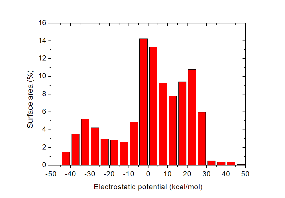 强弱这个说法比较含糊。分子表面不同区域静电势正负、大小各有不同,有时得分区域导论。从定量上说,可以讨论静电势最大值、静电势最小值、静电势整体/正值/负值区域平均值、静电势正值/负值各自区域的面积等等。 这些值都可以通过Multiwfn的定量表面分析功能来得到,可参考《使用Multiwfn的定量分子表面分析功能预测反应位点、分析分子间相互作用》(http://hi.baidu.com/sobereva/item/6601fff28c4fd9d643c36acc)。另外,在作完静电势的定量分子表面分析后在Multiwfn中可以看到一个选项Output surface area in specific value range of mapped function,将它的输出信息做成柱形图,可以很清楚地看到不同静电势大小所占分子表面的面积,如下所示,这对于讨论以静电势的正值还是负值区域为主导、强度大小很有意义。 Figure 5.png |