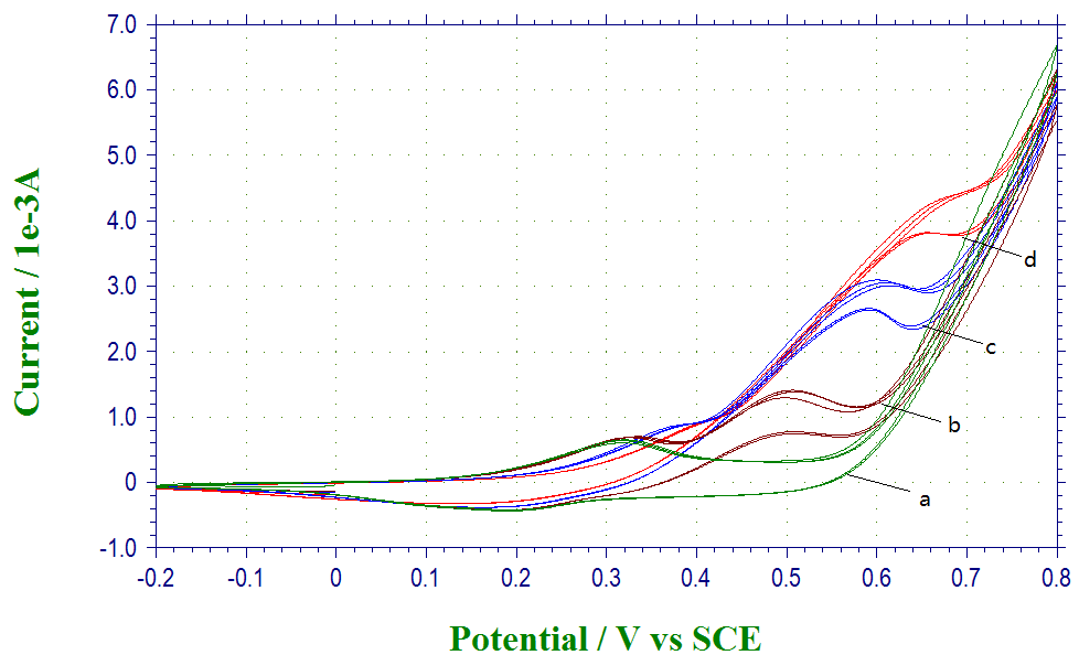我用循环伏安法测试镍钴合金对乙醇的催化活性。工作电极是镍钴合金修饰的玻碳,对电极是铂片,参比电极为SCE。在没有乙醇的时候,只有一对氧化还原峰,估计是镍或钴的,有了乙醇的溶液,有新的氧化还原峰出现。但是乙醇浓度增大,峰电流增大的同时还逐渐右移,这是怎么回事?理论上应该是波动不大才对吧? CV.png |