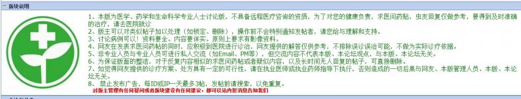 -------------------------------------------------☆☆☆医学版块欢迎你☆☆☆---------------------------------------------------- 1、发帖和回帖前请认真阅读小木虫论坛基本规则和小木虫医学版版规。 2、本版为医学、药学和生命科学专业人士讨论版,不具备远程医疗咨询的资质,虫友回帖仅做参考。 3、本版块实行专家指数( MedEPI)奖励制度,鼓励原创和有意义的交流。 4、本板块鼓励大家积极应助,但严禁刷应助指数。 5、本版严禁发布广告,严禁求助文献和中文书籍,请不要随意留QQ号、邮箱等联系方式。 绿色通道: 申请关贴退币;专家顾问招聘;版主招聘 ===================================================================================== [ Last edited by 缩++影 on 2013-3-7 at 13:28 ] |