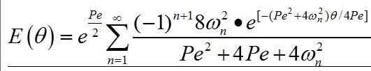在非理想流动中,轴向扩散模型有E(θ)的计算公式如附件图片所示,在求出Pe及ωn的前提下如何得出E(θ)关于θ的值,在线等高人解答啊。如何作出θ~E(θ)的图像来作为理论分布图。