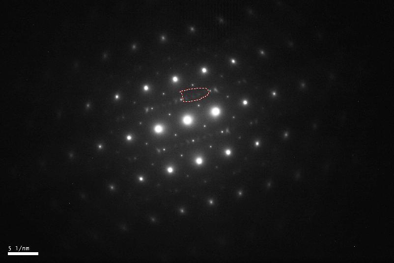 大家好,本人的样品是Fe的金属间化合物,是有序相,下图是011晶带轴下的衍射谱,但是不知道在两个亮的斑点中间,那些排成一列列的,弱的衍射斑点是什么,以前拍到过的衍射谱都不是这样的,如图2。偶也查过文献,没有报道过。另外,从明暗场像中也没看出啥特别的来,本身有磁性,所以也照不了高分辨。
