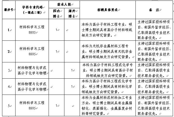 山东科技大学材料科学与工程学院2013年教师需求信息 为了进一步加强师资队伍建设,促进学院更快更好地发展。2013年度根据工作需要,面向社会公开发布教师需求信息,现将相关要求公布如下: 一、需求岗位及具体要求(见下表) 二、遴选方式 根据简历及相关材料初选、面试试讲的方式进行选拔。要求参加遴选的人员于2013年3月20日前将简历及相关材料电子版发至学院邮箱。经学院初选后,将向符合条件的人员发出面试通知,参加学院组织的面试及试讲,最终学院将根据面试结果和具体需要择优进行录取。 三、联系方式 联系人:材料科学与工程学院教学科研办公室 张老师 联系电话:0532-86057921 学院邮箱:jianlan929@126.com 学院网址:http://cmse.sdust.edu.cn/ 材料科学与工程学院 2013-3-7 需求信息表.jpg [ Last edited by sunhaiqing on 2013-3-11 at 00:21 ] |