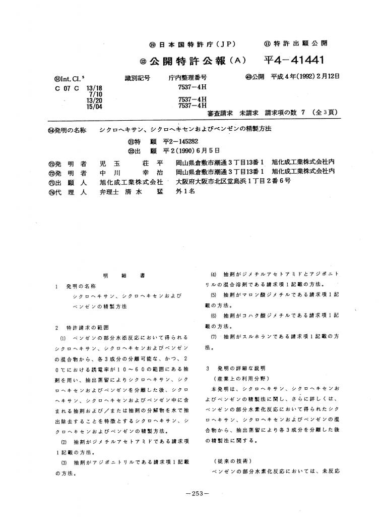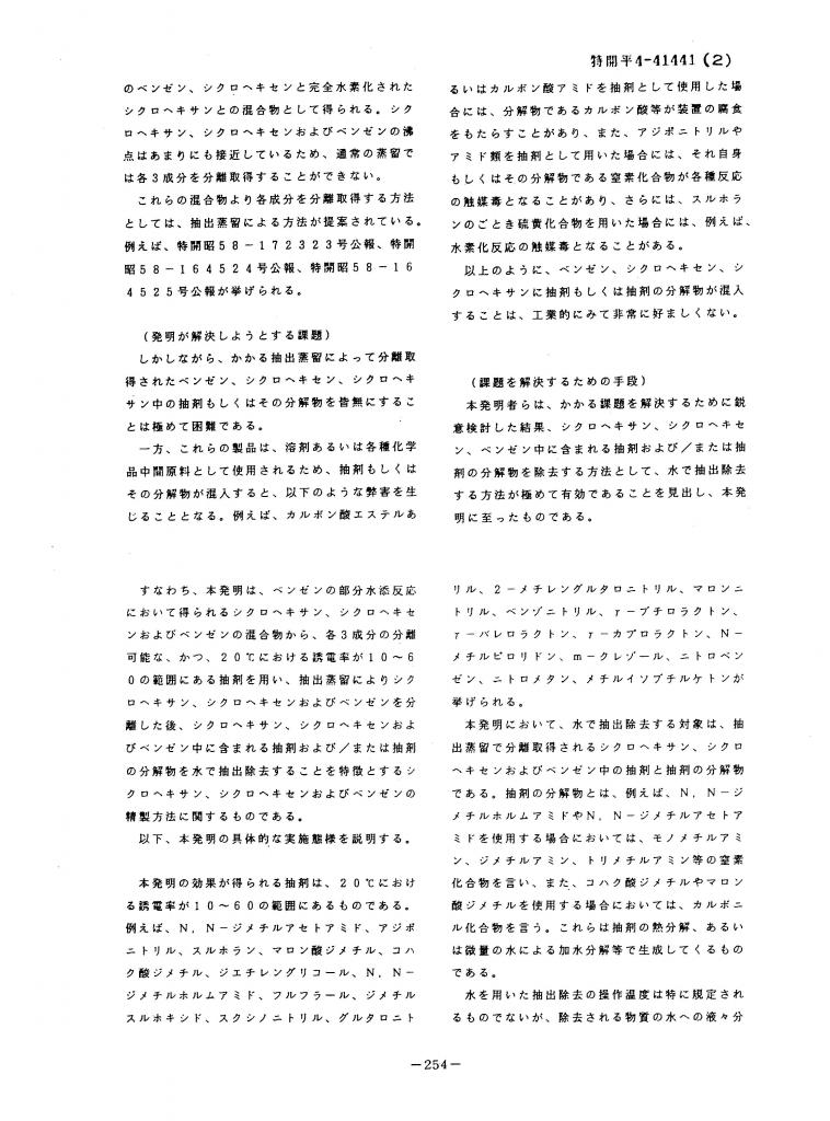 本专利提出从以上三种混合物中采用20℃下介电常数为10~60的萃取剂,采取萃取蒸馏分离环己烷,环己烯和苯混合物后,环己烷,环己烯以及苯中含有的萃取剂/及萃取剂的分解产物用水萃取即可除去的分离的方法 请求项1的中: (2)二甲基乙酰胺作为萃取剂的请求 (3)己二氰作为萃取剂请求 (4)二甲基乙酰胺和己二氰的混合溶剂作为萃取剂的请求 (5)马来酸二甲酯作为萃取剂的请求 ( 6)琥珀酸二甲酯作为萃取剂的请求 (7)亚砜作为萃取剂的请求 本发明的详细说明 (产业上的利用范围) 本发明,环己烷,环己烯以及苯的精制,更详尽的是,由苯的部分加氢还原而得到的环己烷,环己烯以及苯的混合物,通过萃取精馏分离得到三个组分的提纯方法。 传统技术 由苯的部分加氢反应而得到未反应的苯,环己烯,加氢彻底得到的环己烷的混合物。苯,环己烯,环己烷三个的沸点过于接近,通常的蒸馏无法分离三组分 由这样的混合物 通过分离而得到各组分的方法,有通过萃取蒸馏的提案。例如,公开的 特开58-172323,特开58-164524以及T-58164525 号专利 本发明解决的课题 但是,通过萃取蒸馏得到的苯,环己烷,环己烯中各组分中,想除去萃取剂以及其分解物极其困难 另一方面,这样制备得到的产品,无论作为溶剂还是各种化学品的中间体使用时,混入的萃取剂或者其分解物的话,会有以下的弊害。例如,羧酸乙酯或者羧酸胺使用时,其分解产生的羧酸具有腐蚀性,会腐蚀使用装置。并且环己二腈或者酰胺类的萃取剂时,自身或者其分解物会使催化剂中毒,更严重的使用亚砜等含硫化合物时,加氢反应的催化剂中毒. 在以上的情况下,苯,环己烯,环己烷中含有萃取剂以及分解物的情况下,对工业生产非常不利 解决本课题所采用的手段 本发明人员,经过细致讨论的结果,环己烷,环己烯和苯含有萃取物/及萃取剂的分解物去除方法中,用水去除非常有效,这是本发明亮点,是本发明突出之处 进一步, 本发明提出由苯的不完全氢化物(环己烷,环己烯和苯), 用20℃下介电常数为10~60的萃取剂,采取萃取蒸馏分离环己烷,环己烯和苯混合物后,环己烷,环己烯以及苯中含有的萃取剂/及萃取剂的分解产物,用水即可除去的分离的方法 以下通过具体的操作实例说明 具有本发明效果的萃取剂有: 20℃下介电常数为10~60的萃取剂,例如:N,N-二甲基乙酰胺,己基二氰, 亚砜,,马来酸甲酯,琥珀酸二甲酯,乙二醇二甲醚、,N,N-二甲基甲酰胺,a-呋喃醛、二甲亚砜、丁二氰、グルタルロニトリル、2,4-二甲基丁晴、丙二氰、 r-丁内酯、r-r-戊内酯、r-己内酯,基吡咯酮,m-cresol、苯氰,乙氰、甲基异丙酮 本发明,采用水去除的对象,为萃取精馏环己烷,环己烯和苯后残余的萃取剂以及其分解物.萃取剂的分解物,例如使用N,N-二甲基甲酰胺, N,N-二甲基乙酰胺的时候,为甲胺,二甲胺或三甲胺等含氮的化合物; 而使用琥珀酸二甲酯或马来酸二甲酯时得到羧酸化合物,这些萃取物的热分解以及进入微量水分而产生的水解产物. 虽然用水去除杂质的操作温度不是固定的,但是去除物质和液液分配比在低温区比较高,因此较适宜的温度为10~70℃,20~60℃更优.而操作压力为常压,加压和减压均可 ` 萃取剂去除的操作,虽然单一的水即十分有效果,但是加入酸,碱或者盐会使去除效果可能更好. 本发明的实施实例,虽然间歇式,连续萃取都可以,但是连续式较优,而连续式的情况下,向流接触式更好 水的使用量没有特别的限制,根据制品中含有的萃取剂以及分解产物的浓度以及分配比而定 发明的效果’ 本发明的方法,环己烷,环己烯以及苯的混合物得到很好的分离精制而得到各组分 并且,这种方法得到的环己烷,环己烯以及苯均可以作为工业原料使用 进一步,本萃取蒸馏操 避免了 ,为了防止萃取物以及其分解物混入而采用过大的蒸馏操作,的弊端,在工业上具有极大的价值 实施实例1 环己烷,环己烯和苯的混合物,以N,N-二甲基乙酰胺作为萃取剂萃取分离时纯度99.5%(weight)的环己烷,99.7%(weight)的环己烯,以及99.9%(weight)的苯.另外,各种馏分中二甲胺分别5ppm,4ppm,2ppm 接着,得到的个物质,为了使环己烯可以使用长4m,塔径150φ的填料塔使用,由塔顶水进水速度30Kg/h,塔底进料(萃取蒸馏得到的环己烯)速度100Kg/h,结果从塔顶得到的环己烯无二甲胺检出(no detected) 实施实例2 ZSM-5 1Kg水加入反应器,,120℃,6K/C的条件下,按照实施1精馏得到的环己烯按照500g/h连续进行加氢后,反应器出口的油中环己醇的浓度为,由反应开始12.51%,到10小时后的10.45%基本不变. 比较实例1 实施实例1萃取蒸馏分离得到的环己烯,按照实施例2进行同样的反应,反应器出口的环己醇的转化率,开始12.43%,10小时后降低为7.83% |