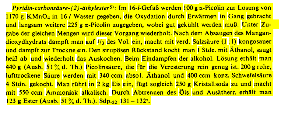 The syrup dired cake is heated to reflux in ethanol for 1 hour, filtered under hot condition. The filter cake is boiled in ethanol again and filtered under hot conditions. The mother liquor is concentrated, 440g of pyridine-2-carboxylic acid (51% yield, theoretical:859g) is obtained.