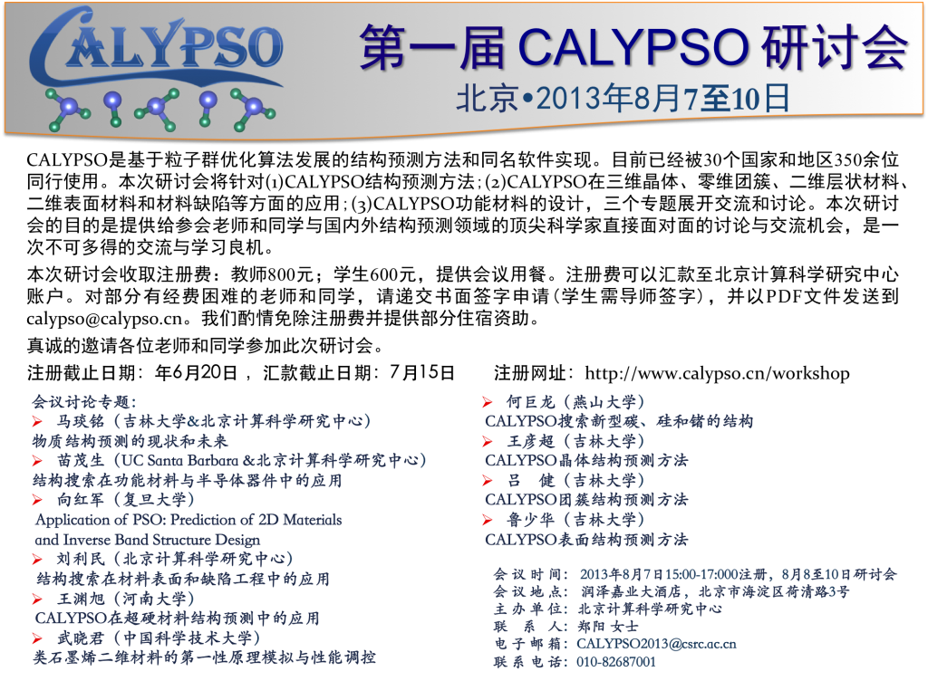 地点:北京 时间: 2013年8月7至10日 CALYPSO是基于粒子群优化算法发展的结构预测方法和同名软件实现。目前已经被30个国家和地区350余位同行使用。本次研讨会将针对(1)CALYPSO结构预测方法;(2)CALYPSO在三维晶体、零维团簇、二维层状材料、二维表面材料和材料缺陷等方面的应用;(3)CALYPSO功能材料的设计,三个专题展开交流和讨论。本次研讨会的目的是提供给参会老师和同学与国内外结构预测领域的顶尖科学家直接面对面的讨论与交流机会,是一次不可多得的交流与学习良机。 本次研讨会收取注册费:教师800元;学生600元,提供会议用餐。注册费可以汇款至北京计算科学研究中心账户。对部分有经费困难的老师和同学,请递交书面签字申请(学生需导师签字),并以PDF文件发送到calypso@calypso.cn。我们酌情免除注册费并提供部分住宿资助。 真诚的邀请各位老师和同学参加此次研讨会。 注册截止日期:年6月20日 ,汇款截止日期:7月15日 注册网址:http://www.calypso.cn/workshop 会议讨论专题: 马琰铭(吉林大学&北京计算科学研究中心) 物质结构预测的现状和未来 苗茂生(UC Santa Barbara &北京计算科学研究中心) 结构搜索在功能材料与半导体器件中的应用 向红军(复旦大学) Application of PSO: Prediction of 2D Materials and Inverse Band Structure Design 刘利民(北京计算科学研究中心) 结构搜索在材料表面和缺陷工程中的应用 王渊旭(河南大学) CALYPSO在超硬材料结构预测中的应用 武晓君(中国科学技术大学) 类石墨烯二维材料的第一性原理模拟与性能调控 何巨龙(燕山大学) CALYPSO搜索新型碳、硅和锗的结构 王彦超(吉林大学) CALYPSO晶体结构预测方法 吕 健(吉林大学) CALYPSO团簇结构预测方法 鲁少华(吉林大学) CALYPSO表面结构预测方法 会 议 时 间: 2013年8月7日15:00-17:000注册,8月8至10日研讨会 会 议 地 点: 润泽嘉业大酒店,北京市海淀区荷清路3号 主 办 单 位:北京计算科学研究中心 联 系 人:郑阳 女士 电 子 邮 箱:CALYPSO2013@csrc.ac.cn 联 系 电 话:010-82687001 CALYPSO.png [ Last edited by gavinliu7390 on 2013-3-12 at 14:13 ] |