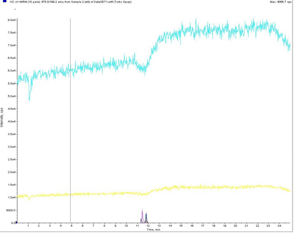 纵坐标是intensity,是离子峰或者什么的强度,counts per second, 只要有东西出来,总会有个强度的,如果是sim检测,除非是分辨率特别高的质谱,否则不可能在基线的时候特别干净...