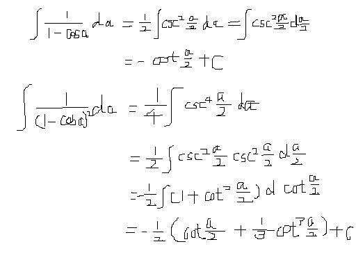 ∫[1/(1-cosα)]dα和∫[1/(1-cosα)^2]dα,请各位详细说一下积分办法还有结果,谢谢啦 [ Last edited by 超级丐中丐 on 2013-3-14 at 12:35 ] |