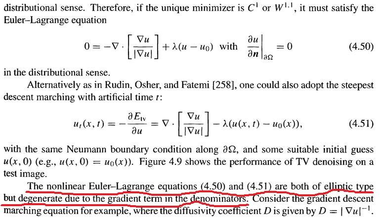 一直不太清楚,什么叫做“某某偏微分方程是退化的”?见附件中描述,其中,u表示一副图像,也就是函数。红线处,说两个方程都是椭圆的,但都是退化的,因为梯度项,不太明白,怎么就是退化的了? PDE退化.JPG |
