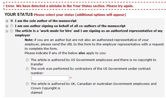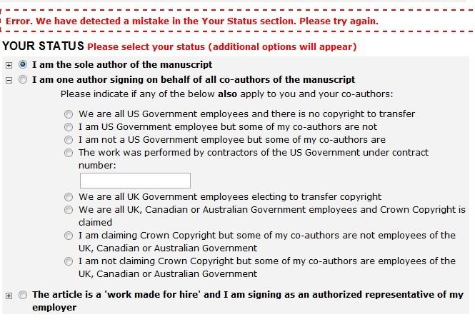 小弟第一次投SCI期刊,一杂志已经愿意接受,要我签署在线协议(oline agrement),他有几个选项,,可是都不符合我们的,请哪位大哥帮我看下,我该怎么选,,,下面是全部选项,,请问我该怎么选?我投的是艾斯维尔的期刊。