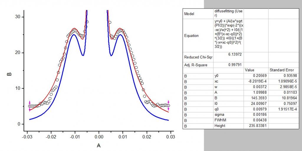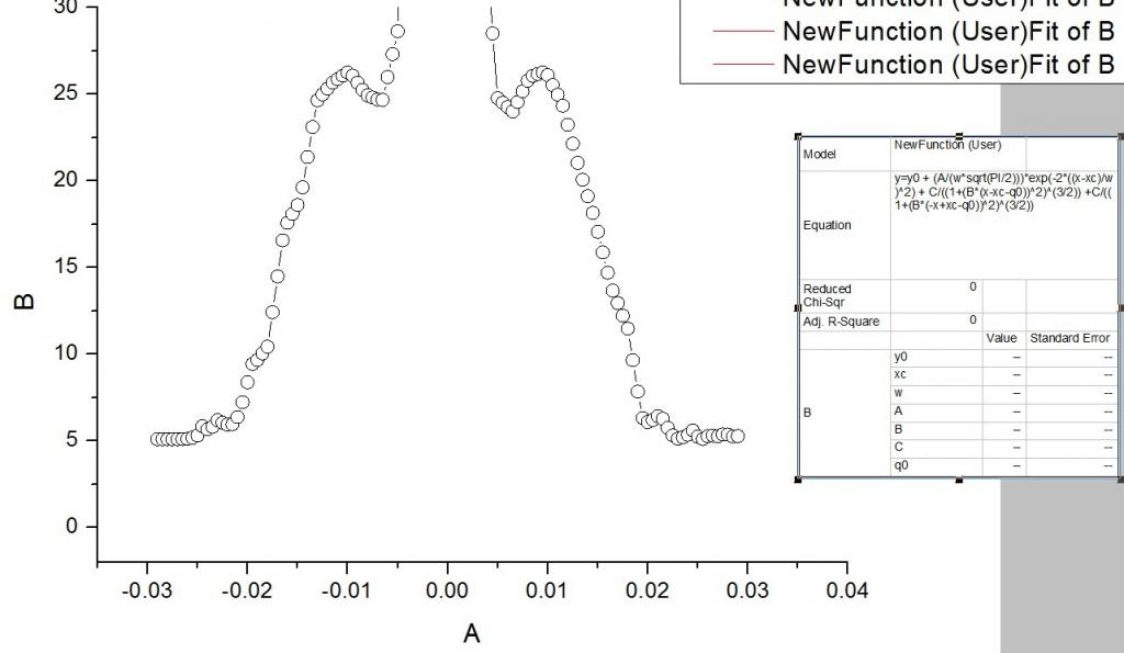 公式和数据 y=y0 + (A/(w*sqrt(PI/2)))*exp(-2*((x-xc)/w)^2) + I0/((1+(B*(x-xc-q0))^2)^(3/2)) +I0/((1+(B*(-x+xc-q0))^2)^(3/2)) x y -0.029 5.1 -0.0285 5.1 -0.028 5.1 -0.0275 5.1 -0.027 5.1 -0.0265 5.10174 -0.026 5.11982 -0.0255 5.18017 -0.025 5.31294 -0.0245 5.84999 -0.024 5.67145 -0.0235 5.81114 -0.023 6.19153 -0.0225 6.05487 -0.022 5.93959 -0.0215 5.95445 -0.021 6.37436 -0.0205 7.2293 -0.02 8.38688 -0.0195 9.44283 -0.019 9.67034 -0.0185 10.05087 -0.018 10.43139 -0.0175 12.42345 -0.017 14.49861 -0.0165 16.57377 -0.016 17.58375 -0.0155 18.09867 -0.015 18.61359 -0.0145 19.63705 -0.014 21.37906 -0.0135 23.12107 -0.013 24.65803 -0.0125 24.99714 -0.012 25.33624 -0.0115 25.67534 -0.011 25.88463 -0.0105 26.07587 -0.01 26.2671 -0.0095 26.08985 -0.009 25.67664 -0.0085 25.26343 -0.008 24.94888 -0.0075 24.82471 -0.007 24.70054 -0.0065 24.68189 -0.006 26.00168 -0.0055 27.32146 -0.005 28.64125 -0.0045 49.77101 -0.004 75.70529 -0.0035 101.63956 -0.003 134.68376 -0.0025 173.86947 -0.002 213.05519 -0.0015 241.77606 -1E-3 241.95314 -5E-4 242.13021 0 242.30728 5E-4 200.82224 1E-3 159.3372 0.0015 117.85215 0.002 91.74117 0.0025 71.26669 0.003 50.79221 0.0035 37.68324 0.004 33.10118 0.0045 28.51912 0.005 24.7815 0.0055 24.52567 0.006 24.26984 0.0065 24.01401 0.007 24.56509 0.0075 25.17979 0.008 25.79448 0.0085 26.06919 0.009 26.16769 0.0095 26.26619 0.01 26.10607 0.0105 25.54206 0.011 24.97805 0.0115 24.3488 0.012 23.25049 0.0125 22.15217 0.013 21.05386 0.0135 20.07568 0.014 19.11807 0.0145 18.16046 0.015 17.07029 0.0155 15.88631 0.016 14.70233 0.0165 13.67503 0.017 12.95509 0.0175 12.23516 0.018 11.47823 0.0185 9.65635 0.019 7.85349 0.0195 6.31727 0.02 6.09173 0.0205 6.19881 0.021 6.42909 0.0215 6.28467 0.022 5.74007 0.0225 5.32489 0.023 5.12049 0.0235 5.2104 0.024 5.34531 0.0245 5.60036 0.025 5.24807 0.0255 5.10401 0.026 5.27833 0.0265 5.30362 0.027 5.26895 0.0275 5.36758 0.028 5.37231 0.0285 5.25785 0.029 5.27417 |