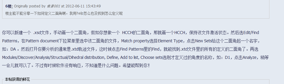 ×Ô¼ºÌáÎÊ×Ô¼º½â´ð£º ¾ßÌåÓõ½Find Patterns dialog¡£ÏÈ´Ó³¤Á´ÖÐcopy³ö4¸öCÏàÁ¬µÄ½á¹¹£¬·ÅÔÚÒ»¸öеÄÎļþ3D AtomisticÎļþÖУ¬»òÕßÊÖ¶¯»4¸öCÏàÁ¬µÄ½á¹¹£¬±£´æ£¬ÃüÃûΪdihedral.xsd¡£Óù¤¾ßÏäÖÐmeasure torsionÀ´²â¶¨Õâ4¸öCµÄdihedral angleµÄÖµ£¬´Ëʱdihedral.xsdÖгöÏÖtorsionµÄÖµ¡£±£´ædihedral.xsd£¬²¢Ñ¡ÖÐÕâ¸ödihedralµÄÖµ£¬×¢ÒⲻҪѡÔñÉÏÔ×Ó¡£ µ÷»»µ½Òª²âÁ¿dihedral angleµÄÎļþ»òÕ߹켣Îļþ£¬ÓÃedit-->find pattens¡£ÔÚpattern documentÀïÑ¡Ôñdihedral.xsd£¬ÔÚmatch propertyÀïÑ¡ÔñelementType£¬µã»÷Find¡£È»ºóËùÓк¬4¸öCµÄ¶þÃæ½ÇµÄÖµ¶¼¼ÆËã³öÀ´ÁË£¬ÕâÐèҪʱ¼ä¡£ ÓÃforcite-->analysis£¬´Ëʱ°´Ô¤ÉèÖµ£¬ µãanalyze¼´¿É£¬²»ÓÃÑ¡ÔñsetsÏȻºó¾Í»á³öÀ´dihedral angleµÄ·Ö²¼Í¼ ![]() ![]() ![]() |