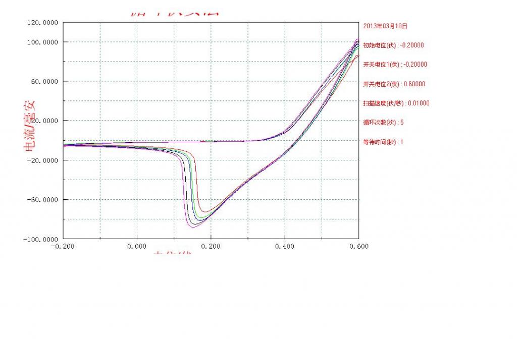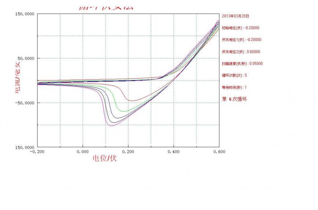 制备出的氢氧化镍在6mol/LKOH电解质溶液中循环伏安曲线如下,多次测试只有还原峰没有氧化峰,电位窗口也调整了多次,依然没有氧化峰,并且右上角出现了重叠交叉,求助大家,想知道具体原因,谢谢! 11.JPG 12.JPG |