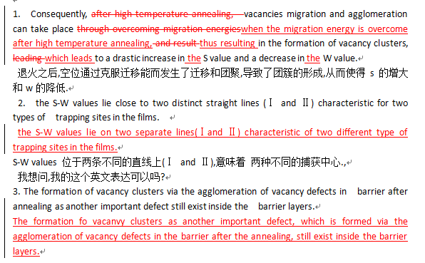 1. Consequently, after high temperature annealing, vacancies migration and agglomeration can take place through overcoming migration energies and result in the formation of vacancy clusters, leading to a drastic increase in S value and a decrease in W value. 退火之后,空位通过克服迁移能而发生了迁移和团聚,导致了团簇的形成,从而使得s的增大和w的降低. 2. the S-W values lie close to two distinct straight lines (Ⅰ and Ⅱ) characteristic for two types of trapping sites in the films. S-W values 位于两条不同的直线上(Ⅰ and Ⅱ),意味着 两种不同的捕获中心., 我想问,我的这个英文表达可以吗? 3. The formation of vacancy clusters via the agglomeration of vacancy defects in barrier after annealing as another important defect still exist inside the barrier layers. 谢谢哈 谢谢 |