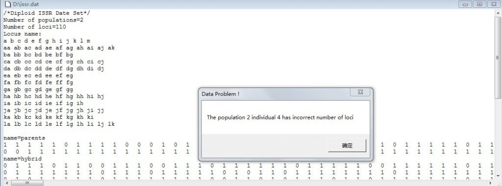 用popgene分析ISSR数据时出现The population 2 individual 4 has incorrect number of loci。如图。哪位高人知道怎么办啊! 未命名.jpg |