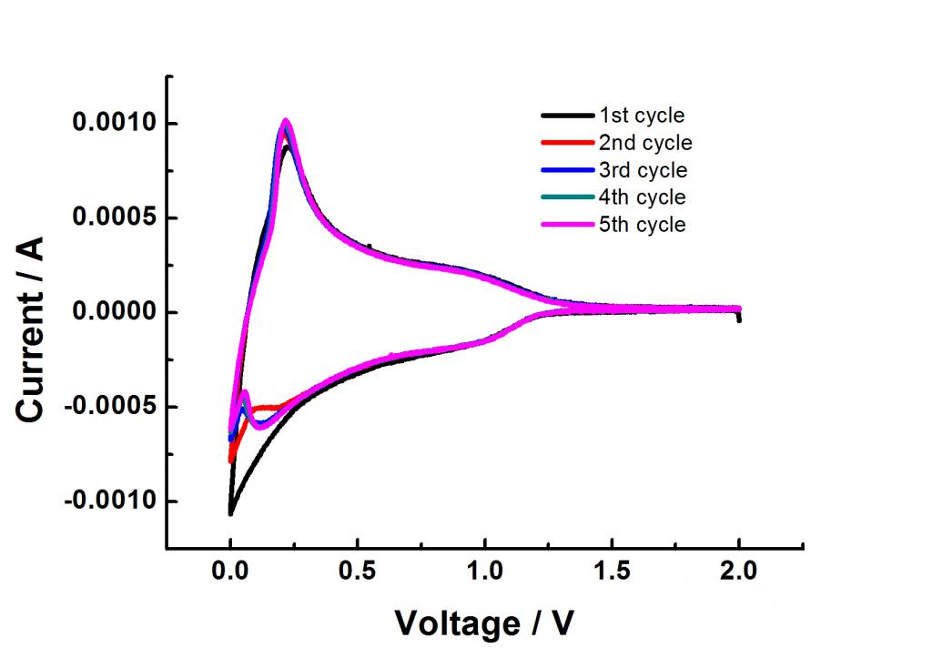 谁能帮我分析一下我测出来的循环伏安曲线啊,为什么第一次循环在0.2V处没有峰,但是后面的循环却出现了呢,它对应的是什么反应啊。谢谢啦!材料是煤沥青制得的硬碳。