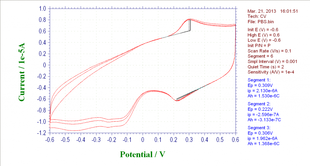 金纳米材料修饰玻碳电极在0.5MH2SO4溶液、PBS溶液、NaOH中扫CV图