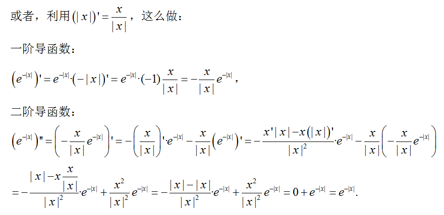| 在x=0处不可导。当x不等于0是,注意到exp(-|x|)是偶函数,所以一阶导函数是奇函数,二阶导函数又是偶函数,所以,你只需要求出它在x<0上的一阶导函数和二阶导函数就行了,这个就很简单了,因为在x<0的时候的函数表达式是exp(x),所以一阶和二阶导函数还是exp(x),从而在x>0时的一阶和二阶导函数分别是-exp(-x)和exp(-x)。当然,更直接的办法就是写出exp(-|x|)的分段表达式,然后分段求导也行。 |