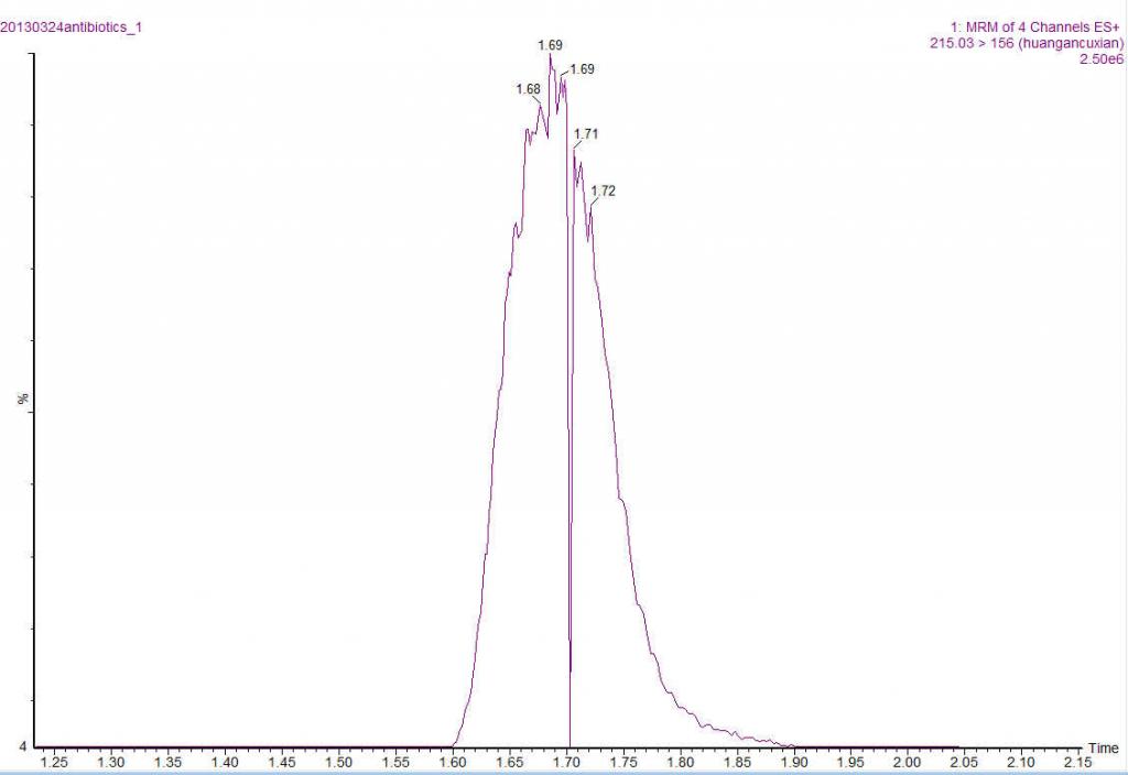 如图片~~在做多组分抗生素液质分析的时候~~第一个出峰的物质~~磺胺醋酰的峰~~不知道为什么就这样了~~使用的流动相是甲醇:乙腈(1:1)和水线性梯度~磺胺醋酰的峰大约出在1.69min 求指导~谢谢~ 磺胺醋酰分叉峰.jpg |