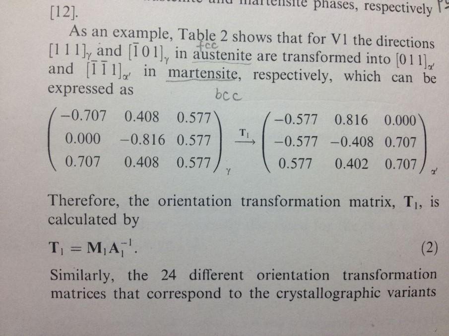 本人最近刚刚涉及EBSD中晶向的研究,对晶向指数和矩阵的关系不明白。比如面心立方的[111]转变为体心立方的 [011],写成矩阵变换的形式。看论文中不明白,拍了张图片放在附件了。麻烦各位大侠帮助看一下,这个矩阵是怎么出来的。非常感谢了!