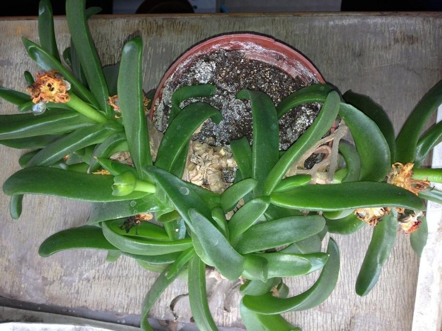 查到了,是番杏科舌叶花属的佛手掌Glottiphyllumuncatum http://baike.baidu.com/view/187391.htm |