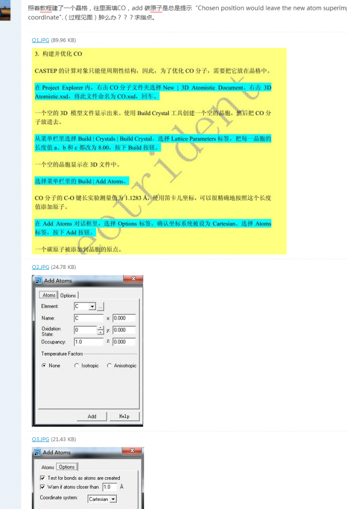 照着教程建了一个晶格,往里面填CO,add 碳原子是总是提示“Chosen position would leave the new atom superimposed on an existing atom.Please choose another coordinate".(过程见图)肿么办???求指点。 MS请教,菜鸟级,实在不会整了…… .png |