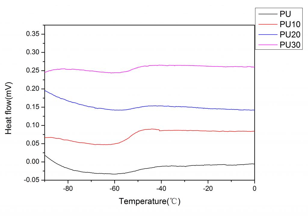 请问下该图片由PU-PU10-PU20-PU30能看出玻璃化转变温度的变化吗?由于当时机器出现问题,软件没法分析,有没有能够手动画出来的。还有一个问题就是这个是聚氨酯和聚氨酯和纳米磷酸钙的复合材料。我想问下,聚氨酯的软段结晶度下降是不是玻璃化转变温度一定要变化呢?还有热焓值变化和结晶度有关没,或者和玻璃化转变温度有没有一定的关系。热焓值降低说明什么问题呢?