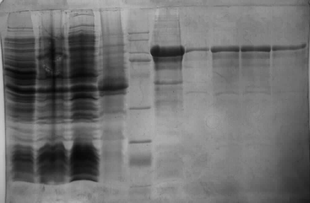 我今天刚录入好,回答别人的一个类似问题,顺便贴在此处,以供参考。 目的蛋白没有挂在亲和柱上,可能有四种情况,原因与解决方法如下: 第一种情况:目的蛋白的(His)6标签在重折叠时没有位于蛋白质分子的表面上,或者由于临近的空间的一个或者多个氨基酸的空间位阻阻碍了(His)6与Ni形成螯合的共价键。但是一般情况下,带有(组氨酸)6标签的蛋白质与树脂的结合并不需要蛋白质具有任何功能型结构,即使存在强变性试剂存在时也如此。 不过可能比较少的时候蛋白质的折叠形态发生了改变会隐藏(组氨酸)6标签,而使得蛋白质无法挂柱。这与存在强变性试剂时(组氨酸)6标签无法隐藏并不矛盾,因为有强变性试剂时蛋白质的肽链一般呈伸展状态,而(组氨酸)6亲水性强,且有一定刚性,所以其结和Ni形成螯合的共价键不会有太大的空间位阻。但是如果(组氨酸)6被包括在蛋白质分子之中,那则另当别论了。这样的包裹(组氨酸)6不是不可能形成。 因为比毕竟在一级结构上加了(组氨酸)6标签,一般构建时除了在(组氨酸)6与目的蛋白质之间留有凝血酶等酶切位点外,适当的还要留下几个亲水的氨基酸残基的空档,以免影响目的蛋白质的正常折叠。因为根据蛋白质折叠的拼图”模型(Jigsaw model):组成蛋白质的绝大多数氨基酸决定其折叠,替换其中的少数(≤5%)的氨基酸残基,蛋白质折叠形成的最终构象不会发生改变 Jigsaw model可能有三种叙述: a. 每一种蛋白质可以有不同的折叠路径,2003年S. Giant 等.报道:Cytochrome C551有平行的折叠路径。 b.组成蛋白质的绝大多数氨基酸决定其折叠,替换其中的少数(≤5%)的氨基酸残基,蛋白质折叠形成的最终构象不会发生改变。 c.组成蛋白质的氨基酸中那些处于疏水核中的氨基酸残基,与其邻近的其他的氨基酸残基的电荷相互作用和空间楔合,对于蛋白质的折叠和构象稳定性起到了决定性作用。第二种情况:你用buffer不适合目的蛋白的(His)6与Ni形成螯合的共价键。 第二种情况是溶液环境的影响了蛋白质的折叠形态,使得目的蛋白的(His)6标签在折叠时没有位于蛋白质分子的表面上。影响因素:如pH,离子强度,其他蛋白质分子,缓冲溶液类型,有关影响蛋白质分子表面的试剂等。 以上两种情况的解决方法:增加所提的蛋白质样品的溶解度,楼主可考虑一下:比如适量增加变性试剂浓度或类型使得蛋白质的肽链松散开暴露出(组氨酸)6标签。另外,还可以加大离子型、非离子型或两性离子表面活性剂的浓度或类型,加大DTT浓度(DTT浓度<1mmol/L,否则DTT会与Ni2+结合),适当调整调高盐浓度(氯化钠溶液低于2mol/L,从低浓度到高浓度逐渐分梯度上升),总之,作用就是增加蛋白质的可溶性,因为(组氨酸)6的亲水性较强,增加可溶性之后(组氨酸)6容易暴露在水相。加大DTT浓度也可以切断二硫键使得蛋白质的肽链松散,进而使(组氨酸)6容易暴露在水相。 第三种情况,有比邻的组氨酸的污染蛋白质与Ni-NTA柱结合,而使得带有(His)6标签的目的蛋白没有了结合位点。第三种情况的解决方法:通过降低洗脱液pH值使得His质子化而使得污染蛋白质从层析住上被洗脱,一般有比邻的组氨酸的污染蛋白质不太可能有(His)6的序列,所以逐渐降低洗脱液pH值时,比邻的组氨酸的污染蛋白质会先被洗脱,而带有(His)6标签的目的蛋白会后被洗脱下来。即使这样估计错了,但是至少我们能够确定:有(His)6的序列的目的蛋白质与不带有有(His)6的序列的污染蛋白质被洗脱下来的pH值肯定不一样,所以可以多分些pH值洗脱,对应不同的洗脱峰我们总可以得到目的蛋白质。如果污染蛋白质含量大,而目的蛋白质含量小,可以分别将收集的洗脱产物再次过柱,当然要鉴定那个样品才是目的蛋白质,只要用那一批样品再次过柱。 第四种可能,一些蛋白质或DNA与带有(His)6标签的目的蛋白发生了非特异性相互作用,而使得带有(His)6标签的目的蛋白因为空间位阻或(His)6标签被遮盖而无法与Ni-NTA柱结合。这是可以用低浓度的去污剂(浓度不大于2%的Triton X-100或浓度不大于0.5%SDS)洗涤样品(上样洗脱时);增加洗脱液的盐浓度(氯化钠溶液低于2mol/L);上样液里加入30%-50%的甘油,已减弱疏水相互作用。 |