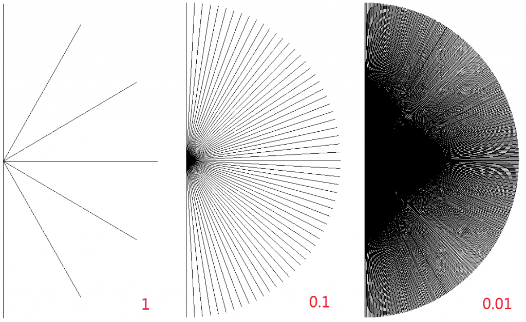 Show[Graphics[ Table[Line[{{0, 0}, {Cos[x*Pi/6], Sin[x*Pi/6]}}], {x, -3, 3, 0.1}]], AspectRatio -> 2, Axes -> False] 把其中的0.1改成1图形就是正常的,改成0.01就有令人崩溃的图了,为什么? |