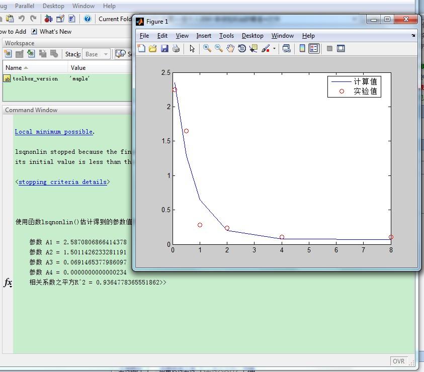 Sample Text t=[0.0833 0.5 1 2 4 8]; c=[2.2505 1.6489 0.2789 0.2412 0.1077 0.1035]; 我用已知的两个函数模型拟合时出现了这种情况 (一)t=[0.0833 0.5 1 2 4 8]; c=[2.2505 1.6489 0.2789 0.2412 0.1077 0.1035]; myfun=inline('A(1)*exp(-A(2)*x)','A','x'); [A iter sse]=nlinfit(t,c,myfun,[1 1]) 结果:A = 2.6400 1.4099 iter = 6 sse = 0.2891 (二):t=[0.0833 0.5 1 2 4 8]; c=[2.2505 1.6489 0.2789 0.2412 0.1077 0.1035]; myfun=inline('A(1)*exp(-A(2)*x)+A(3)*exp(-A(4)*x)','A','x'); [A iter sse]=nlinfit(t,c,myfun,[2.4 1.5 0.022 0.2]) 结果:A = 2.6266 1.4510 0.0227 -0.2002 iter = 19 sse = 0.2734 但是我的这个函数有个要求,就是参数A的值要大于零,这样的话A(4)就不符合了 (三)还有一种情况就是,用二的方式,但我给另外的随意的初值, 结果:A = 0.8571 1.4100 1.7829 1.4098 A(1)+A(3)=2.64,A(2)基本上等于A(4) iter = 6 sse = 0.2891 而这样的话就相当于把(一)的公式拆分成了两个一样模型的函数,与(一)没什么区别,我在用(二)计算式,我希望能够拟合出的结果中A(2)与A(4)不同,但是有还得是正值,所以我想给A(2)和A(4)设边界大于零 该怎么弄,我是matlab的菜鸟用户,请高手帮帮忙,谢谢! [ Last edited by cheng1378653 on 2013-4-1 at 12:52 ] |