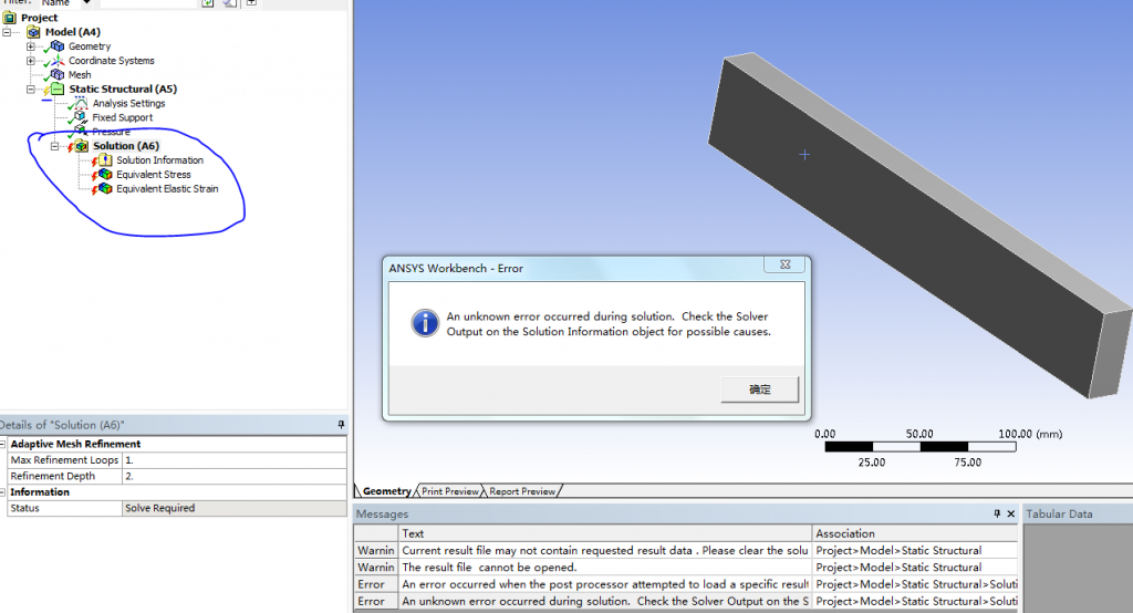 ansys workbench 运算后没有结果显示,出现未知错误